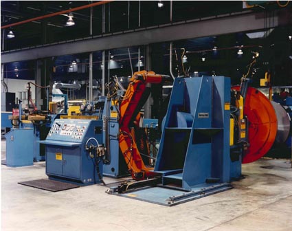- The coil is prepared on the load side prior to rotating it into the pay-off position. The lead end is positioned for threading top or bottom pay-off and the O.D. bands are removed.